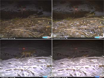 Auf der linken Bildhälfte von Bild 11 hüpft eine Ziege bei Tageslicht von rechts ins Bild, während sie unten auf die Kamera zuschreitet. Ist es dieselbe Ziege? Die kaum lesbaren Zeitangaben 7:15:49 Uhr und 7:16:52 Uhr lassen vermuten, dass die Ziege die Richtung ihres Wegs doch gewechselt hat.