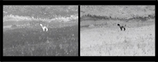 | Infrarot-Videoaufnahmen Schon zu Beginn meines Kunstprojektes Wolf im Juni 2010 bin ich über den Herdenschutz auf die ausserordentlichen Nachtvideoaufnahmen des Nationalparks von Mercantour in Frankreich gestossen. Es sind Infrarot-Videoaufnahmen, die im Sommer 2000 auf der Alpage du Longon entstanden sind, um das Verhalten von Schutzhunden und Wölfen zu beobachten.