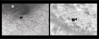 Diese Momente der Suchbewegung und der Motivfindung über den Fokus der Kameraperson sind zentraler Gegenstand dieser Untersuchungen. Dabei interessiert es mich, das Wechselspiel zwischen den ¨fehlerfreien¨ Bildern und den Bildern mit Bildfehlern – der sichtbaren Kameraregulierung des Fokussieren und Erkennens – zu thematisieren. So geht es bei den künstlerisch-visuellen Untersuchungen der Video-Sequenzen darum, den Charakter des Rohmaterials zu bewahren und dieses auf sein atmosphärisches, inhaltliches und poetisches Potenzial hin zu prüfen. Dazu begreife ich das Natur-Bild (Landschaften, Tiere) als Bild-Natur (naturbelassen), indem ich beinahe die gesamte Aufnahmesequenz ¨unbehandelt¨ verwende (auch die mit einem ¨Bildfehler¨). Ausser der Montage wird also keine Bildveränderung vorgenommen. Den Markennamen ¨Sagem¨ der Wärmebildkamera, der oben links im schwarzen Umraum des Bildes geschrieben stand, entfernte ich, da dieser keine zusätzliche Bildinformation liefert.